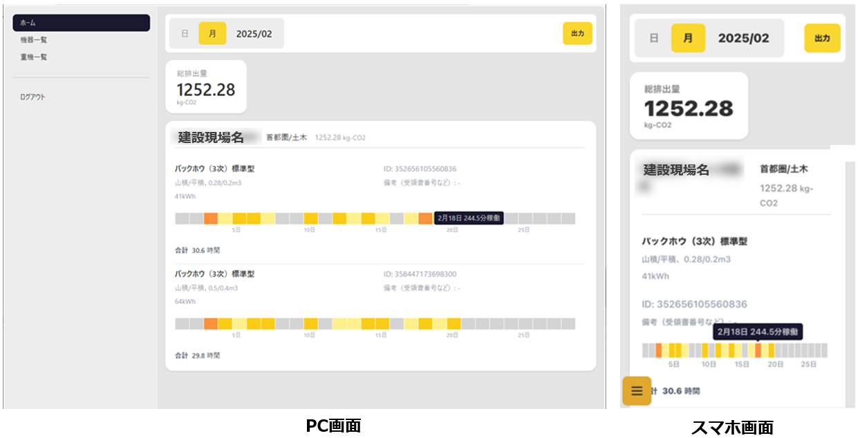 環境負荷データを正確かつ定量的に把握・報告できるようになったことに加え、Webアプリ上で日々の稼働状況を可視化することでアイドリング時間の見直しや、稼働率の低い建設機械の特定といった副次的な活用も進んでいます。