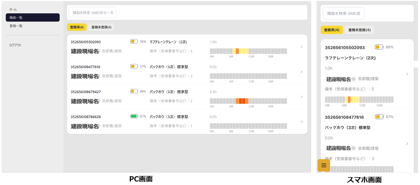 Webアプリは、「ホーム」「機器一覧」「重機一覧」などの画面で構成され、稼働状況は日単位・月単位で切り替え可能。視覚的にわかりやすいカラーバー形式で、1時間ごとまたは1日ごとの稼働率が色分け表示される仕組みです(図2参照)。これにより、作業のピーク時間や未稼働時間を一目で把握することができます。