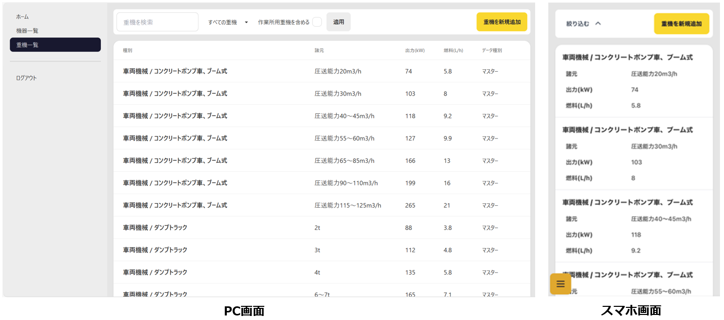 また、「重機一覧」画面では、登録された建設機械の型式ごとに、あらかじめ設定された排出原単位(CO₂排出量の基準値)を一覧表示。初期情報にない建設機械についても、新規登録が可能となっており、他の企業様への対応も視野に入れた設計としています。