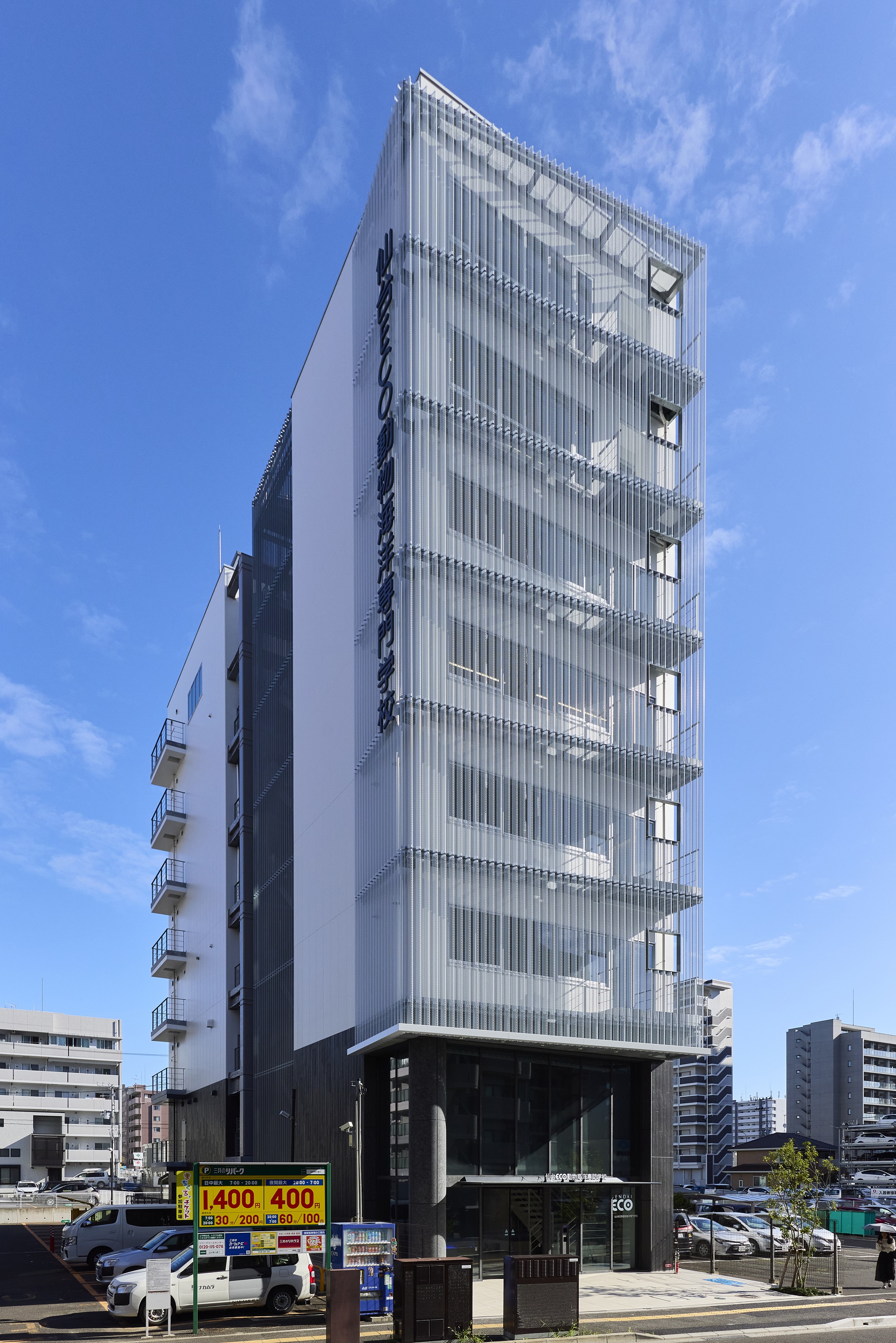 本件は学校法人滋慶学園様の宮城県仙台市では5校目となる校舎です。仙台駅から徒歩8分の立地にあり、海洋動物及び昆虫などの生育に特化した校舎となっております。中には巨大水槽や昆虫生態展示室もあり、素晴らしい教育環境を提供出来る建物となっております。また、1階には擬岩に囲まれた巨大LEDスクリーンを設置しており、擬岩の中を海洋動物が悠々と泳ぐ映像が流れ、エンターテインメント性も高い建物となっております。お客様の要望をできる限り忠実に再現しました。間口が狭く狭隘な土地ではありましたが、最大限魅せられる建物となっております。夜間のライティング及び擬岩LEDモニターは仙台の観光にいらした方にも是非見ていただきたい建物となっております。