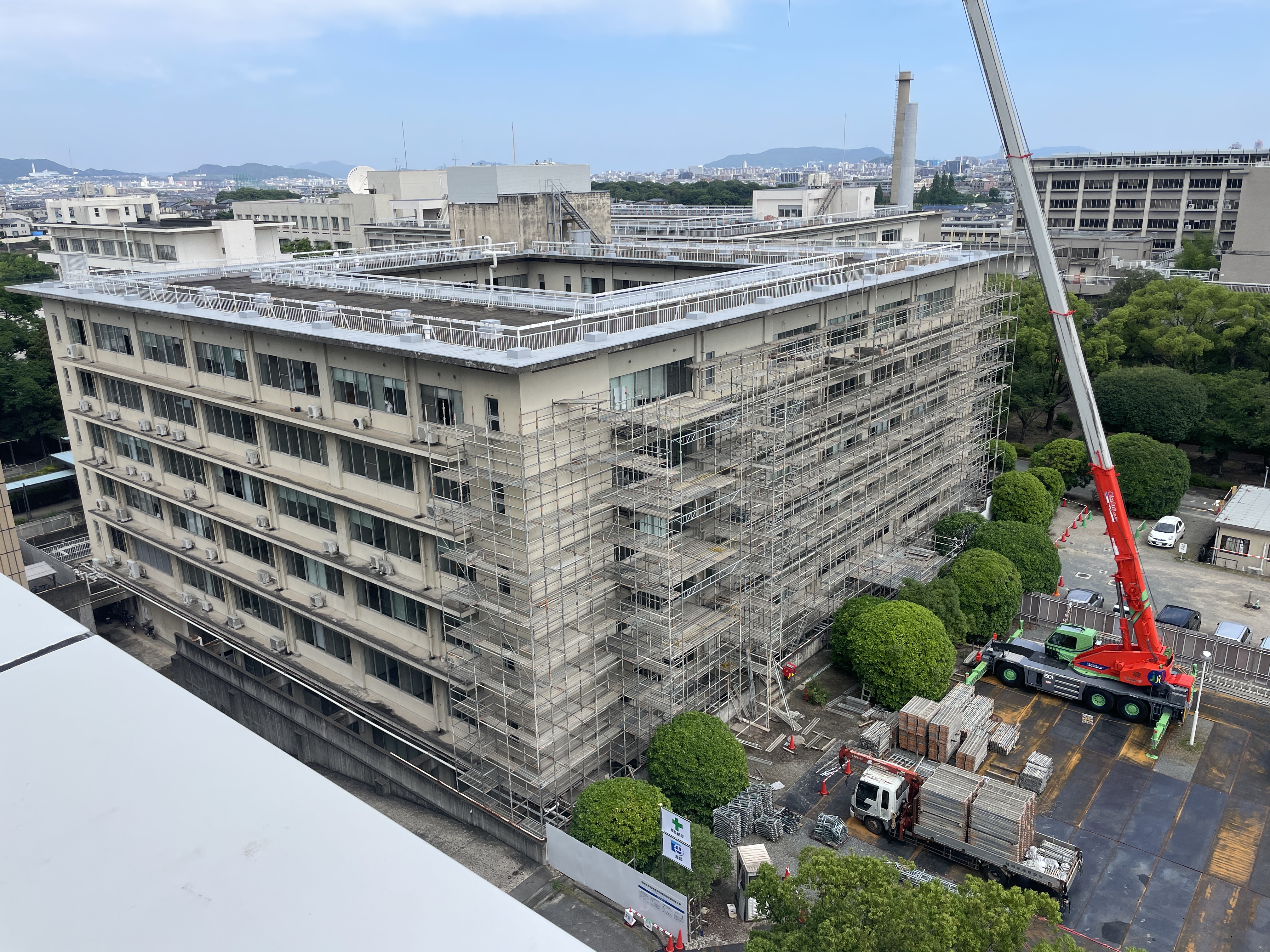 当工事は昭和53年竣工の福岡大学医学部研究棟別館(SRC造・地下1階、地上5階建)の耐震改修工事です。RC耐震壁と耐震鉄骨ブレースを新設し設備機器と内装仕上げも改修します。外装は経年劣化部分の修繕と外壁塗装を全面改修します。学生、病院関係者、病院利用者等の多くの人の往来がある為、安全に十分配慮し、2026年3月末竣工を目指します。
