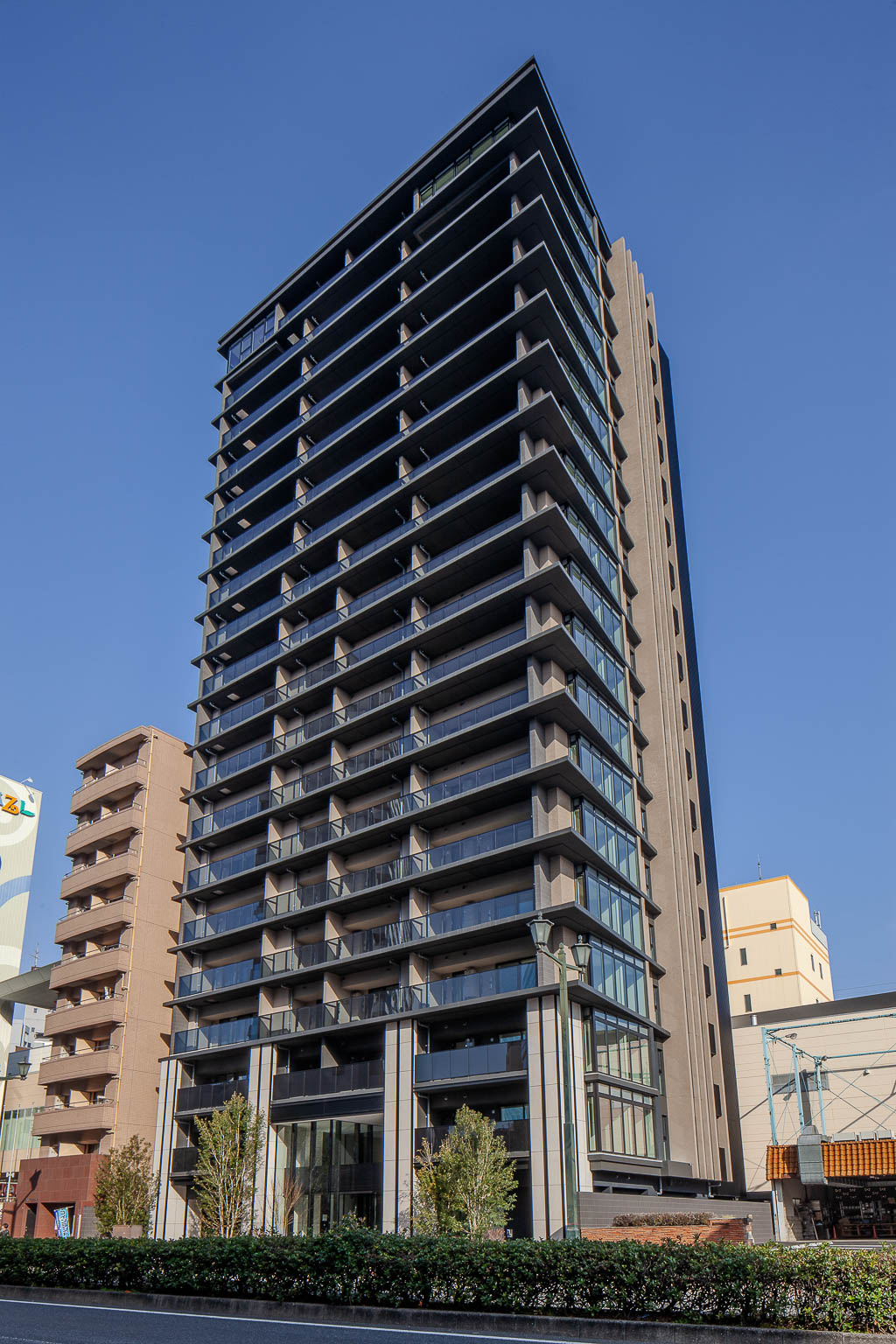 本工事はJR広島駅から二駅目というアクセス性を擁する横川駅から徒歩1分強に位置する新築分譲マンションです。様々な建物群と人々が往来する活気あふれる駅前繁華街エリア内においても、外観に設けたフィン状の水平ラインと垂直ラインが特徴的かつ都会的で力強い印象を与え、横川のシンボリックな「新しいランドマーク」として完成を迎えました。